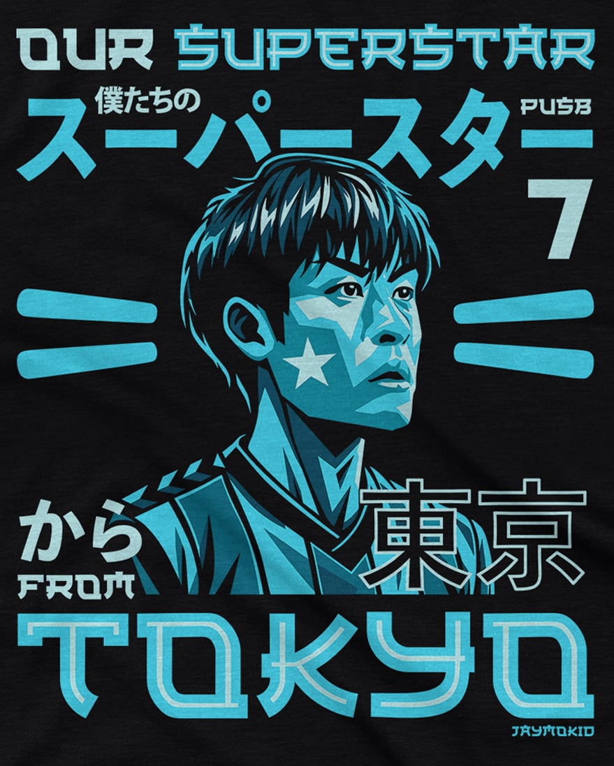 Capturing the diminutive right winger, wrapped in vibrant Japanese-inspired lights and striking kanji-style typography that nods to his roots.